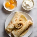 A white plate holds three rolled crepes, two are cut in half to show thin, light golden layers with a soft, slightly porous texture inside, while the third is fully wrapped showing smooth, lightly browned spots on its surface. Above the plate, there is a white bowl with two bright, yellow egg yolks sitting in clear egg whites, and next to it is another white bowl filled with white creamy cheese that looks soft and spreadable, all placed on a white marbled surface. Photo taken with an iphone --ar 4:5 --v 7