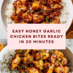 This 20-minute Honey Garlic Chicken Bites recipe is a quick and flavorful dish perfect for busy weeknights. Tender chicken cubes are coated in a crispy crust then tossed in a sweet and savory honey garlic glaze. It’s easy to make and sure to become a family favorite.