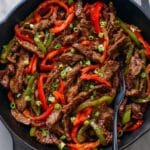 Keywords: pepper steak, stir fry, quick dinner, flank steak recipe, bell peppers, Asian stir fry