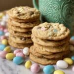 Two stacks of soft, chewy cookies with light golden brown color and visible bits of chocolate chips and colorful candy pieces are placed side by side on a white marbled surface. The stack on the left has seven cookies, a bit thicker and more uneven in shape, while the stack on the right has ten cookies with a slightly smoother texture. Around the stacks are scattered small pastel-colored candy eggs in yellow, white, pink, and blue. Behind the cookies is a decorative green mug with an ornate pattern. The photo taken with an iphone --ar 4:5 --v 7