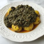 A white ornate plate holds a dish with a thick, dark greenish-black sauce mixed with cooked leafy greens. Beneath the sauce, round, soft yellow pieces, possibly boiled potatoes, are visible, partly covered but clearly layered under the greens. The glossy texture of the sauce shows small bits of spices and herbs, with some oil giving a slight shine. The plate rests on a white marbled surface with a soft light highlighting the rich, hearty texture of the food. photo taken with an iphone --ar 4:5 --v 7