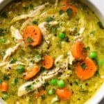 4. Shred chicken and add remaining ingredients: Remove the lid, transfer chicken to a cutting board, and let it cool slightly. Cut into bite-sized pieces or shred using two forks. Return chicken to the pot along with frozen peas (if using) and fresh parsley. Bring back to a slow simmer and allow chicken to warm through and peas to soften and turn bright green, about 5 minutes.