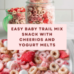 A simple and healthy Baby Trail Mix made with a mix of Very Berry Cheerios, yogurt melts, freeze-dried strawberries, and baby puffs. Perfect as a convenient snack for babies and toddlers, this mix offers a combination of crunchy textures and fruity flavors that little ones will love. Easy to prepare and great for on-the-go snacking.