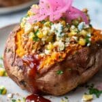 - Assemble and Serve: Once the sweet potatoes are baked, slice them open and fluff the interior. Spoon generous portions of the warm BBQ chicken filling into the sweet potatoes. Top with optional quick-pickled red onions, Mexican street corn salad, and a sprinkle of fresh cilantro to enhance flavor and add freshness. Serve immediately.