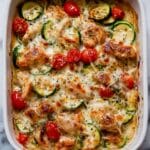 A delicious and healthy Mediterranean Chicken Zucchini Bake featuring tender chicken breasts, fresh zucchini, cherry tomatoes, and aromatic Mediterranean spices, topped with melted mozzarella and Parmesan cheese. Perfect for a quick, flavorful, and nutritious dinner.