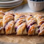 This Blueberry Cream Cheese Danish is a delightful pastry featuring flaky puff pastry filled with a smooth cream cheese mixture and fresh blueberries. Braided with tender strips of pastry and topped with a sweet vanilla glaze, this Danish offers a perfect balance of creamy, fruity, and crispy textures. Ideal for breakfast, brunch, or a sweet treat any time of day.