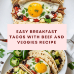 Delicious and satisfying Breakfast Tacos featuring sautéed bell peppers and onions, seasoned shredded beef, fluffy scrambled eggs, warm black beans, and fresh toppings like avocado, tomato, and cotija cheese, all wrapped in soft flour tortillas. A perfect hearty morning meal that combines savory flavors and textures.