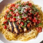 Bruschetta Chicken Pasta is a vibrant, flavorful dish that combines tender oven-baked chicken breasts with fresh bruschetta made of cherry tomatoes, garlic, basil, and balsamic vinegar, served over perfectly cooked pasta and topped with Parmesan cheese and optional fresh mozzarella pearls. This recipe blends Italian classic flavors with a hearty pasta meal for a delightful family dinner or entertaining dish.
