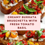 Keywords: Burrata Bruschetta, Italian appetizer, tomato bruschetta, easy bruschetta recipe, burrata cheese, toasted bread appetizer
