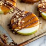 4. Dip Apple Slices in Caramel: If desired, place each apple slice on a stick. Slowly dip each slice into the caramel sauce, allowing excess to drip back into the container. Lay the dipped slices on a parchment paper-lined baking sheet.