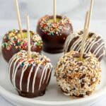 - Add Chocolate and Toppings: If desired, dip the caramel-coated apples into melted semisweet chocolate or drizzle chocolate over them. While the chocolate is still wet, roll or sprinkle your chosen toppings over the apples. For candies like M&M’s, wait for the chocolate to harden slightly before pressing candies to prevent sliding.