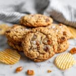 Indulge in these decadent Caramel Kitchen Sink Cookies packed with a delightful mix of salty and sweet flavors. This cookie recipe combines classic chocolate chips, toffee pieces, pretzels, and thick ripple potato chips all wrapped in a soft, buttery dough with gooey caramel centers. Perfect for satisfying all your cravings in one bite!