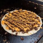 A flat, round tortilla forms the base layer, light beige in color with a soft texture, topped evenly with a thick layer of dark brown cooked meat pieces that look juicy and slightly charred. Over the meat, there are thin zigzag stripes of bright orange creamy sauce spread across the entire surface. The dish is cooking on a large, black flat griddle with some food crumbs scattered around. photo taken with an iphone --ar 4:5 --v 7