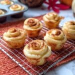 The image shows several small baked bites that have a swirl shape with a slightly browned top sprinkled with a reddish seasoning. Each bite is made of two layers: the base is a light golden crust that looks crispy, and the top is a soft, creamy textured swirl in a pale yellow color with a bronzed finish from baking. They are arranged on a silver cooling rack placed on a white marbled surface with an orange woven mat under part of the rack. In the background, there is a blurred muffin tray with two more bites and a large, round, brown decorative object along with a red leaf on the white marbled texture. Photo taken with an iphone --ar 4:5 --v 7
