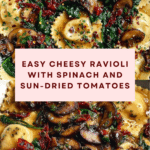 This Cheesy Ravioli with Spinach, Mushrooms, and Sun-Dried Tomatoes is a delicious and easy-to-make pasta dish that combines tender cheese-stuffed ravioli with sautéed mushrooms, vibrant spinach, and flavorful sun-dried tomatoes. Enhanced with garlic and a touch of red pepper flakes, it’s a perfect weeknight dinner that’s both satisfying and full of rich Mediterranean flavors.