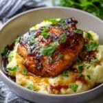 A serving of dark golden brown glazed grilled chicken thigh with a shiny, sticky texture is placed on top of a thick layer of creamy, slightly chunky mashed potatoes in a white bowl. The chicken is sprinkled with fresh green parsley leaves, which are also scattered on the mashed potatoes, adding a bright color contrast. The mashed potatoes show hints of melted butter and herbs, with a drizzle of dark gravy pooling around them. The bowl rests on a white marbled surface with a soft focus on a striped gray cloth nearby and some blurred green parsley in the background. photo taken with an iphone --ar 4:5 --v 7