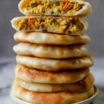 A tall stack of seven round stuffed flatbreads sits on a white plate, each with a light golden-brown, slightly crispy outer layer showing slight puffiness and some soft texture. The top flatbread is cut in half, revealing an inner filling with two clear layers: a bottom layer of soft yellow crumbly mixture, likely scrambled with green herbs, and a top layer of bright orange shredded vegetables, possibly carrots, mixed with more yellow crumbs and green bits. The flatbreads are stacked tightly, showing their soft and thick texture, with the white marbled surface underneath adding a clean, bright background. Photo taken with an iphone --ar 4:5 --v 7