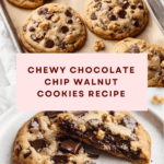 Deliciously soft and chewy Chocolate Chip Walnut Cookies featuring toasted walnuts and rich semi-sweet chocolate chips. These cookies offer a perfect balance of sweetness and crunch, enhanced by a hint of vanilla and a delicate touch of flaky sea salt on top for a gourmet finish.