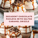 This decadent Chocolate Pavlova with Salted Caramel Sauce combines crispy, airy meringues folded with rich dark chocolate, topped with luscious whipped cream, a homemade salted caramel sauce, and crunchy honey-roasted peanuts for the perfect balance of textures and flavors. A stunning dessert ideal for special occasions or anytime you crave an indulgent treat.