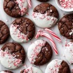Delightfully rich and festive Chocolate Peppermint Cookies featuring a luscious blend of cocoa, espresso, and peppermint flavors, topped with a white chocolate dip and crushed candy canes for a perfect holiday treat.