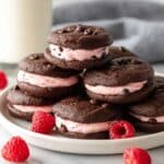 Delightful Raspberry Sandwich Cookies featuring rich cocoa chocolate cookies filled with a luscious raspberry cream cheese frosting. These cookies combine a perfectly baked chocolate base with a smooth, tangy, and sweet raspberry-infused cream cheese filling, making a perfect treat for any occasion.