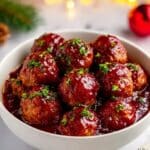 These Christmas Cranberry Meatballs combine savory ground beef or turkey with a tangy and sweet cranberry sauce glaze, making a festive and flavorful appetizer perfect for holiday gatherings or parties.