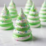 Delightfully crisp and festive Christmas Tree Meringues made with whipped egg whites, sugar, and a touch of vanilla, colored green and decorated with sprinkles for a perfect holiday treat. These light, airy meringues are baked low and slow until dry and crisp, making them an impressive yet simple dessert for the Christmas season.