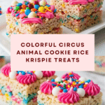 Keywords: Circus Animal Cookies, Rice Krispie Treats, marshmallow treats, colorful dessert, easy no-bake dessert, kid-friendly snack