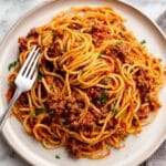 A classic Italian Spaghetti Bolognese recipe featuring tender ground beef simmered in a rich tomato and herb sauce, served over perfectly cooked spaghetti for a comforting and hearty meal.