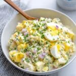 - Prepare aromatics: While the eggs are boiling and cooling, dice the red onions finely and chop the parsley and chives into small pieces to ensure they blend well in the salad.