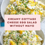 A creamy, tangy Cottage Cheese Egg Salad made without mayonnaise, featuring chopped boiled eggs, diced red onion, fresh herbs, and a smooth blend of cottage cheese, Dijon mustard, and lemon juice for a delicious and healthy twist on classic egg salad.