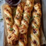 These Cranberry Brie and Thyme Puff Pastry Twists are a delightful appetizer combining flaky, golden puff pastry with creamy brie cheese, sweet and tart cranberry sauce, and aromatic fresh thyme. Perfectly twisted for a beautiful presentation and brushed with egg wash for a shiny finish, they offer a harmonious balance of flavors ideal for festive gatherings or elegant snacks.