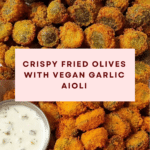 Enjoy crispy, golden-fried pimento-stuffed olives served with a tangy and garlicky vegan aioli. This vegan appetizer is perfectly crunchy on the outside while juicy on the inside, making it an irresistible snack or party bite.