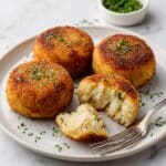 Four round, golden-brown croquettes with a crispy texture sit on a white plate. One croquette is cut in half, showing a soft, creamy light beige inside. Small green herbs are scattered on and around the croquettes for garnish. A silver fork rests on the right side of the plate. In the background, a small white bowl filled with finely chopped green herbs is visible on a white marbled surface. Photo taken with an iphone --ar 4:5 --v 7