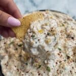 5. Finish and Serve: Once cooking time is complete, garnish the dip with the remaining Tajin. Serve warm with tortilla chips for dipping and enjoy the creamy, spicy street corn-inspired flavor.