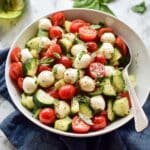 A refreshing and light Cucumber Caprese Salad featuring crisp English cucumber, creamy fresh mozzarella pearls, sweet grape tomatoes, fresh basil, and a tangy balsamic vinaigrette. Perfect as a healthy appetizer or side dish, this no-cook salad combines classic Italian flavors with a summertime twist.