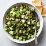 A fresh and vibrant Cucumber Salsa, also known as Cucumber Pico de Gallo, combining crisp cucumbers with zesty lime juice, red onion, cilantro, and a hint of heat from chiles. Perfect as a refreshing condiment or side dish.