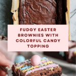 Keywords: Easter brownies, chocolate brownies, festive brownies, holiday dessert, fudgy brownies, chocolate topping, mini candy eggs, pastel chocolate decoration