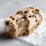 The image shows a close-up view of a chunky dessert bar resting on white parchment paper. The dessert has a rough, uneven texture with a creamy beige outer coating embedded with dark brown and semi-sweet chocolate chips scattered around its surface. Inside, the bar reveals a soft, chewy light brown cookie dough filling with visible chocolate chunks mixed throughout. The dessert is irregularly shaped with noticeable bite marks on the front side, exposing the interior layers clearly. The whole scene is set against a white marbled background. photo taken with an iphone --ar 4:5 --v 7