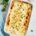 A white rectangular baking dish holds a baked layered dish with a golden-brown melted cheese top sprinkled with small green herb pieces. The top layer is creamy and bubbly, showing slight browning around the edges. Beneath the cheese, soft light beige flat layers, likely tortillas or pasta, can be seen touching the sides. The dish rests on a white marbled surface with fresh green herb sprigs to the left and a small bowl of white sour cream or cream on the upper right side. A light blue and white checkered cloth is partially visible in the bottom left corner. Photo taken with an iphone --ar 4:5 --v 7