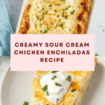 Keywords: sour cream chicken enchiladas, creamy enchiladas, easy Mexican recipe, chicken casserole, green chile sauce, baked enchiladas