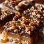 - Step 9: Optionally, sprinkle sea salt flakes on top and drizzle with extra caramel sauce before cutting into bars.