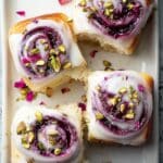 8. Glaze and Garnish: Brush the warm buns generously with the rose glaze. Sprinkle the edible dried rose petals and chopped shelled pistachios on top for an aromatic and visually appealing finish. Serve warm or at room temperature.