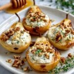 Keywords: blue cheese, stuffed pears, baked pears, appetizer, elegant snack, nuts, thyme, honey