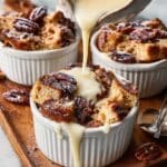 - Combine Bread and Custard: Pour the custard evenly over the bread cubes, gently stirring so every piece is coated. Fold in the chopped pecans and hazelnuts. Transfer the mixture to a greased baking dish or divide into individual ramekins. Let the mixture rest for about 20 minutes so the bread fully absorbs the custard.