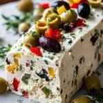 A festive and flavorful holiday appetizer featuring a creamy cream cheese log coated with a vibrant mixture of olives, roasted red peppers, fresh herbs, and dried cranberries. Perfect for serving with crackers or bread at gatherings and celebrations.