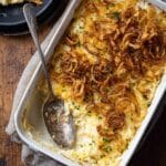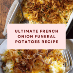 Keywords: French Onion Funeral Potatoes, funeral potatoes recipe, baked potato casserole, cheesy potato casserole, crispy fried onions, comfort food casserole