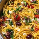 Keywords: Greek spaghetti, Mediterranean pasta, feta pasta, spaghetti with olives, vegetarian pasta dish