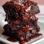 A stack of three thick, rich, dark brown brownies sits on a white plate with glossy, smooth chocolate sauce dripping down each layer and pooling on the plate. The top brownie is sprinkled with small white salt flakes, adding texture and contrast. The brownies have a moist, slightly crumbly texture, with edges that look crispy. The whole scene is set against a white marbled surface and a soft pink background. photo taken with an iphone --ar 4:5 --v 7