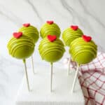 These festive Grinch Cake Pops combine the rich flavor of red velvet cake with vibrant green candy coating to create a fun and delicious holiday treat. Perfect for parties or gifting, these cake pops are decorated with red candy hearts to add a cheerful touch resembling the Grinch theme.